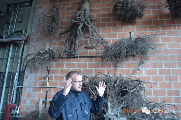 參觀團(tuán)全程由泰樂先生陪同講解,是負(fù)責(zé)銷售比利時(shí)、荷蘭市場(chǎng)的經(jīng)理,學(xué)習(xí)森林植物學(xué)專業(yè)后一直在苗木產(chǎn)業(yè)工作,和之前參觀最大的不同點(diǎn)就是懸掛在墻上的根系,并詳細(xì)講解根系健康的重要性,具有健康旺盛的根系才是合格的商品苗木。