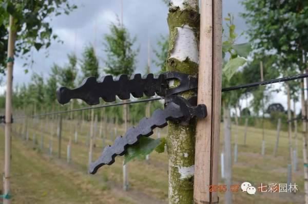 行間拉直固定樹木,采用橡膠扣固定,保護(hù)樹木表皮不會(huì)受損并可多次使用。