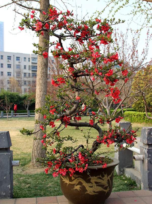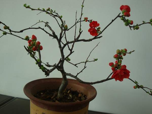 貼梗海棠它又叫作皺皮木瓜,而且還有許多的叫法,是落葉灌木的一種,它在園林綠化上屬于觀花、觀果的優(yōu)良品種;特別是在花期的時候,滿樹花朵非常的艷麗,顏色多樣;貼梗海棠不但在園林效應上有它的風采,而且它的果實還可以吃,果實營養(yǎng)豐富含維生素多,在醫(yī)學上也有它的獨特功效;貼梗海棠在綠化上可以栽種在景區(qū)、道路兩邊、庭院等地方;還可以在一些綠化樹中栽種一兩棵貼梗海棠,可以起到點綴的效果,成片的栽種也有不一樣的觀賞效果;它不僅可以地栽也可以制作為盆景,造型多種,常被放置在客廳、花臺、陽臺、門庭邊都可以,下面我們就來欣賞一下它的各種造型盆景吧: